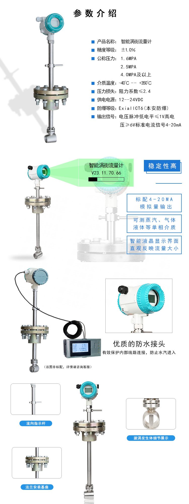 插入式涡街流量计主要用于各种行业工业管道中大口径气体、液体、蒸汽介质流体的流量测量 特点是压力损失小量程范围大精度高在测量工况体积流量时几乎不受流体密度、压力、温度、粘度等参数的影响。